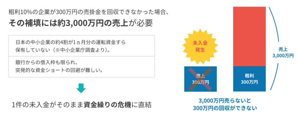 「300万円くらいの未回収なら、他でカバーできる」と思っていませんか? もし300万円が未回収になった場合、それを補填するには3,000万円の新規売上が必要です(利益率10%の場合)。