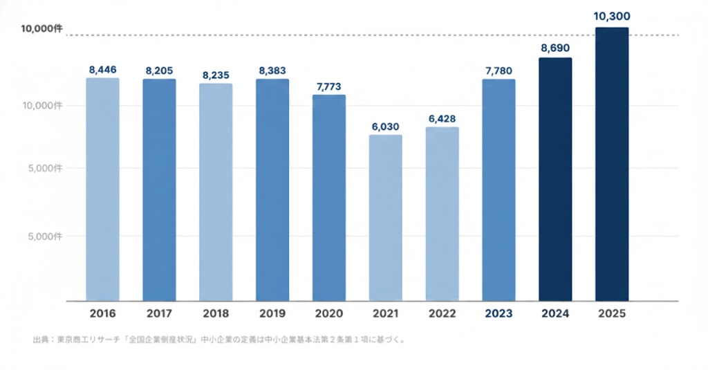 2021年の底からわずか数年で激増しており、2025年にはついに12年ぶりとなる「1万件超え」の大台に乗る見通しです。昨日の優良企業が、今日突然倒産してもおかしくない――日本の中小企業は今、かつてない不安定なフェーズに突入しています。