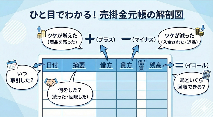 売掛金元帳は、主に5つの項目で構成されています。