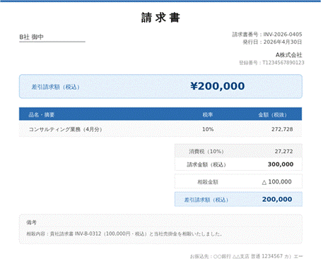 例えば売掛金30万円・買掛金10万円の場合、請求書には「請求金額:300,000円」「相殺金額:△100,000円」「差引請求額:200,000円」と記載します。相殺金額の前に「△」「▲」「−」のいずれかの記号をつけて、マイナスであると明確に示してください。