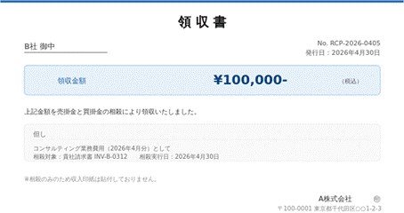 - 相殺した旨の明記(「上記金額を売掛金と買掛金の相殺により領収しました」など)