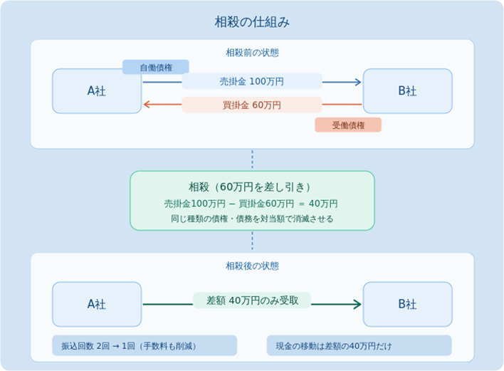 例えばA社がB社に100万円の売掛金を持ち、同時にB社に対して60万円の買掛金がある場合、60万円分を差し引いて残りの40万円だけを受け取ります。